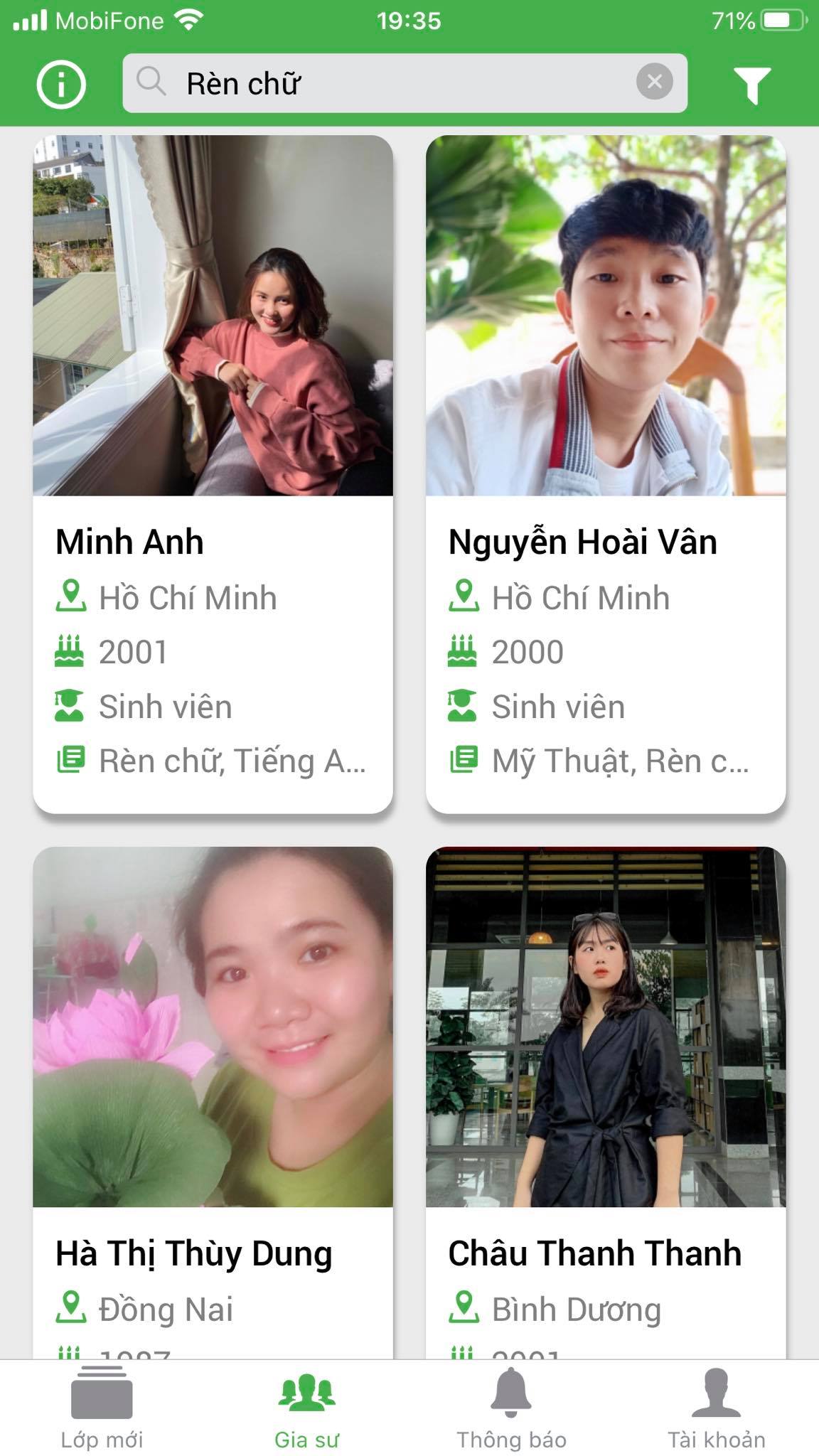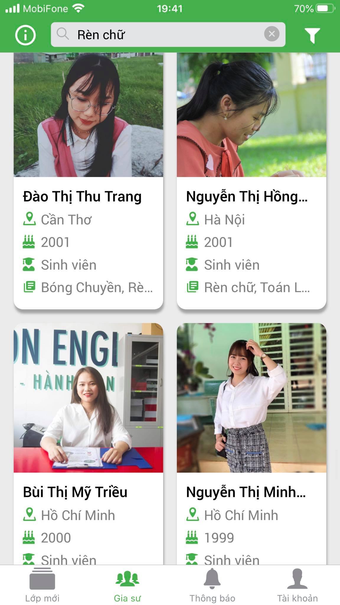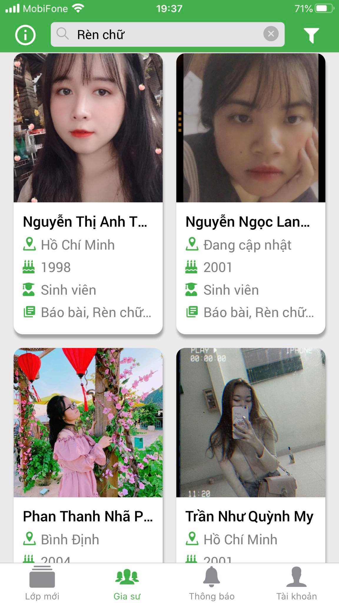 Văn phòng Gia Sư TÀI NĂNG TRẺ hiện đang cộng tác với rất nhiều Giáo viên & Sinh viên ưu tú của các trường: ĐH Sư Phạm, ĐH Tự Nhiên, ĐH KHXH & NV, ĐH Bách Khoa, ĐH Y Dược, ĐH Kinh Tế, ĐH kiến Trúc… trên địa bàn Thành Phố, nhằm tạo ra 1 đội ngũ Gia sư có chuyên môn cao, đáp ứng mọi nhu cầu học tập và rèn luyện cho tất cả học sinh ở mọi cấp, mọi trình độ.