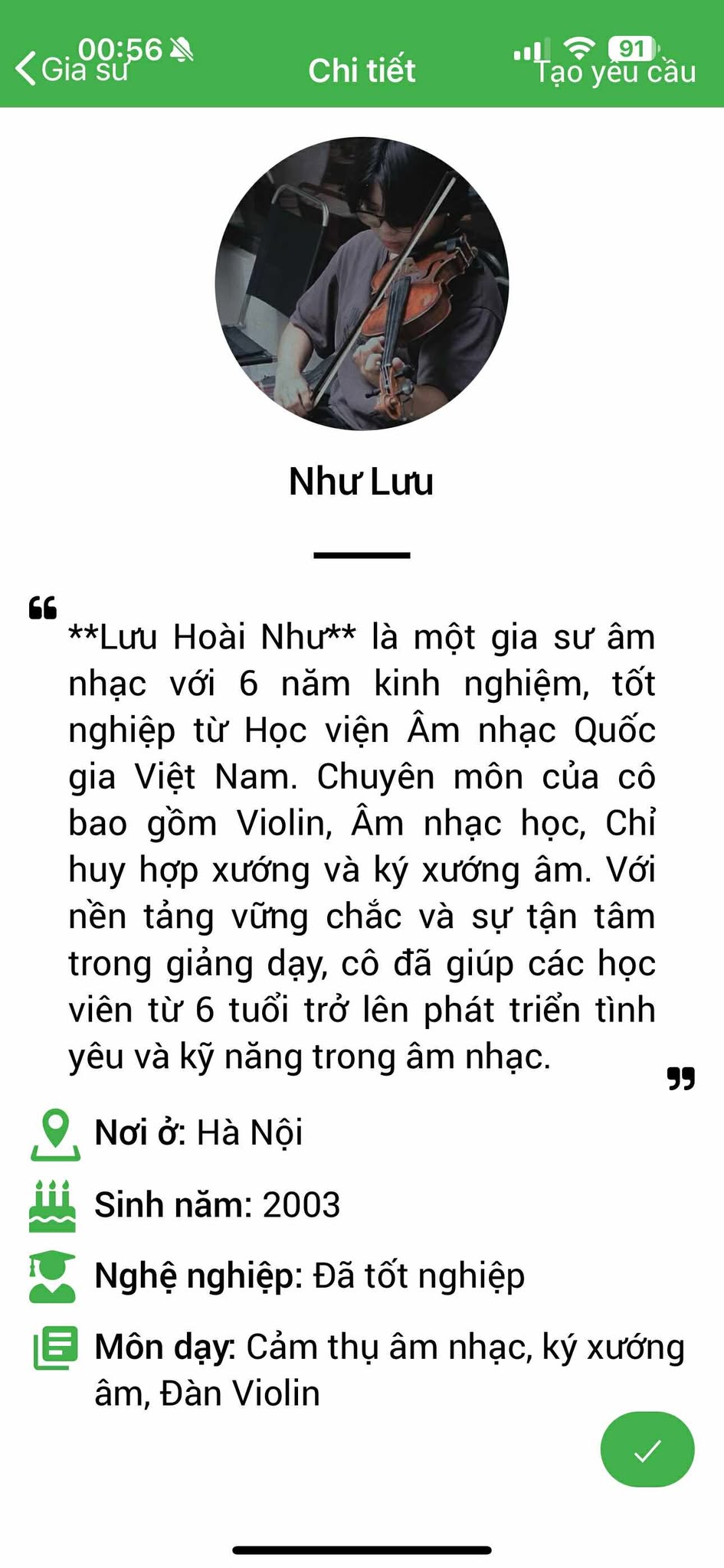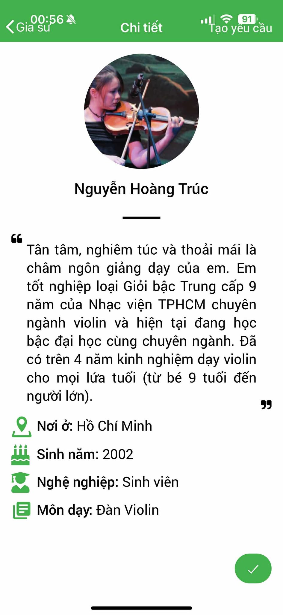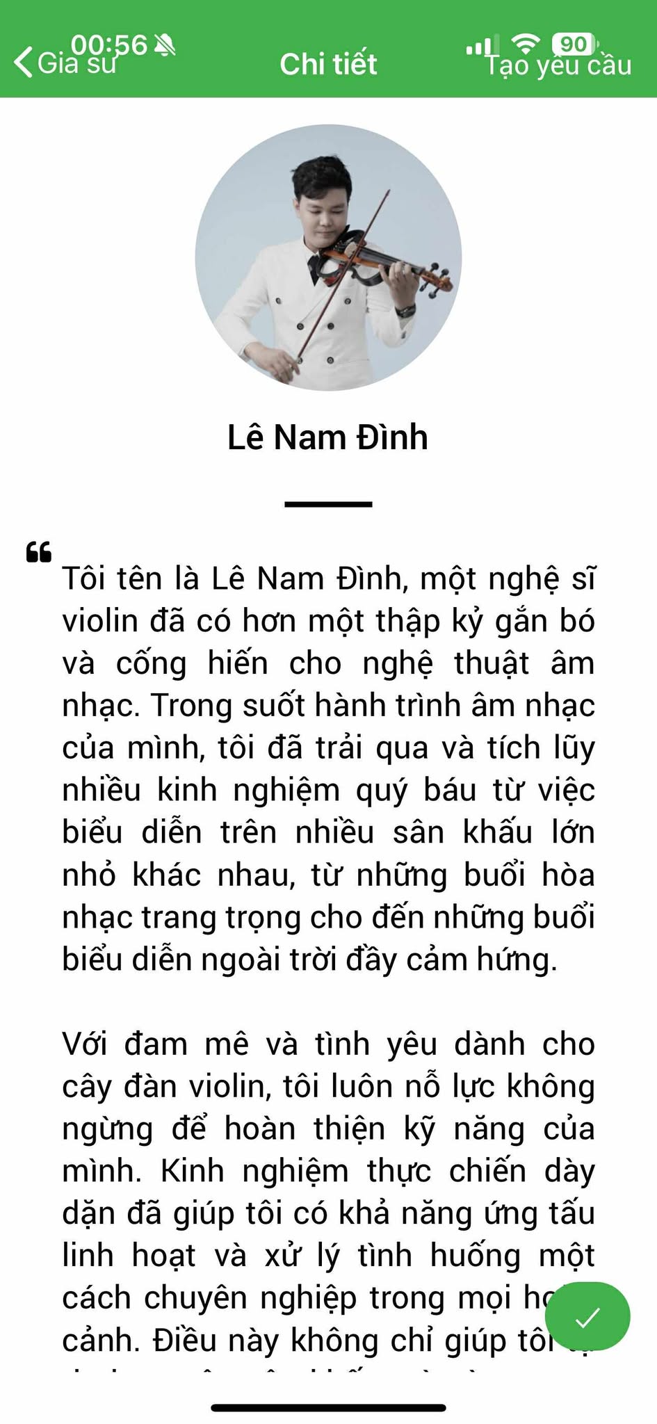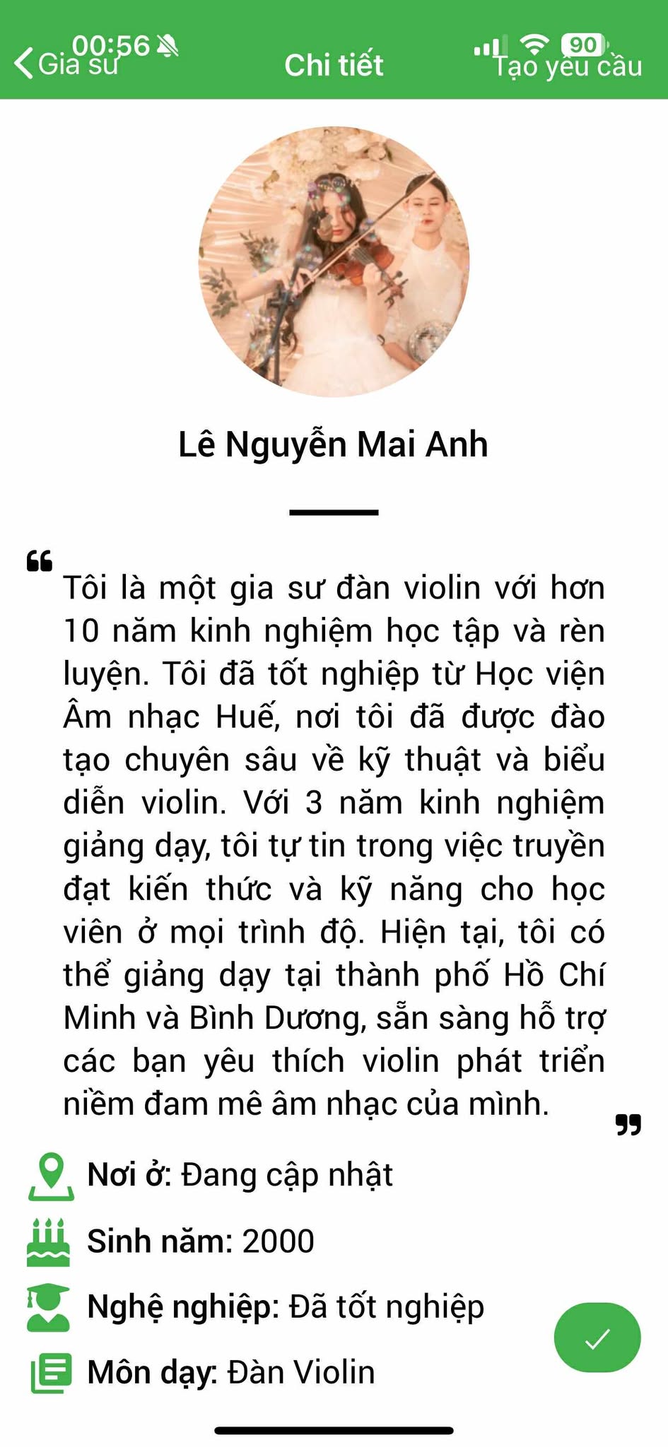 - Đa số gia sư có từ 3 -10 năm kinh nghiệm dạy đàn Violin cho học viên mọi lứa tuổi, trình độ khác nhau.